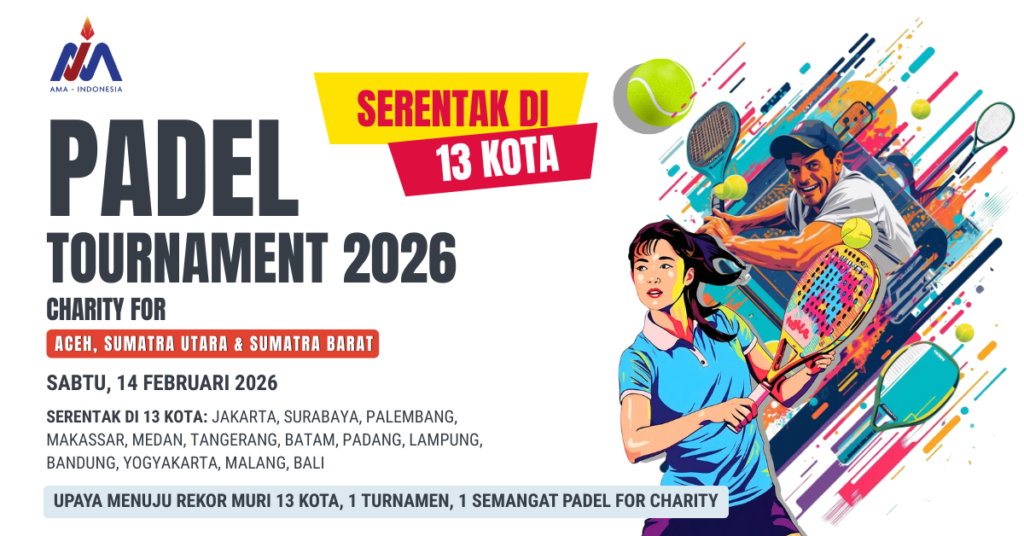 AMA Indonesia bersama 13 Badan Pengurus Cabang akan menyelenggarakan AMA Indonesia Padel Tournament 2026 – Charity for Aceh, Sumatera Utara dan Sumatera Barat yang akan diadakan pada Hari Sabtu, 14 Februari 2026 serentak di 13 Kota. Kota yang berpartisipasi diantaranya Jakarta, Tangerang, Surabaya, Bandung, Yogyakarta, Malang, Bali, Medan, Lampung, Palembang, Padang, Batam, dan Makassar. Kegiatan […]
